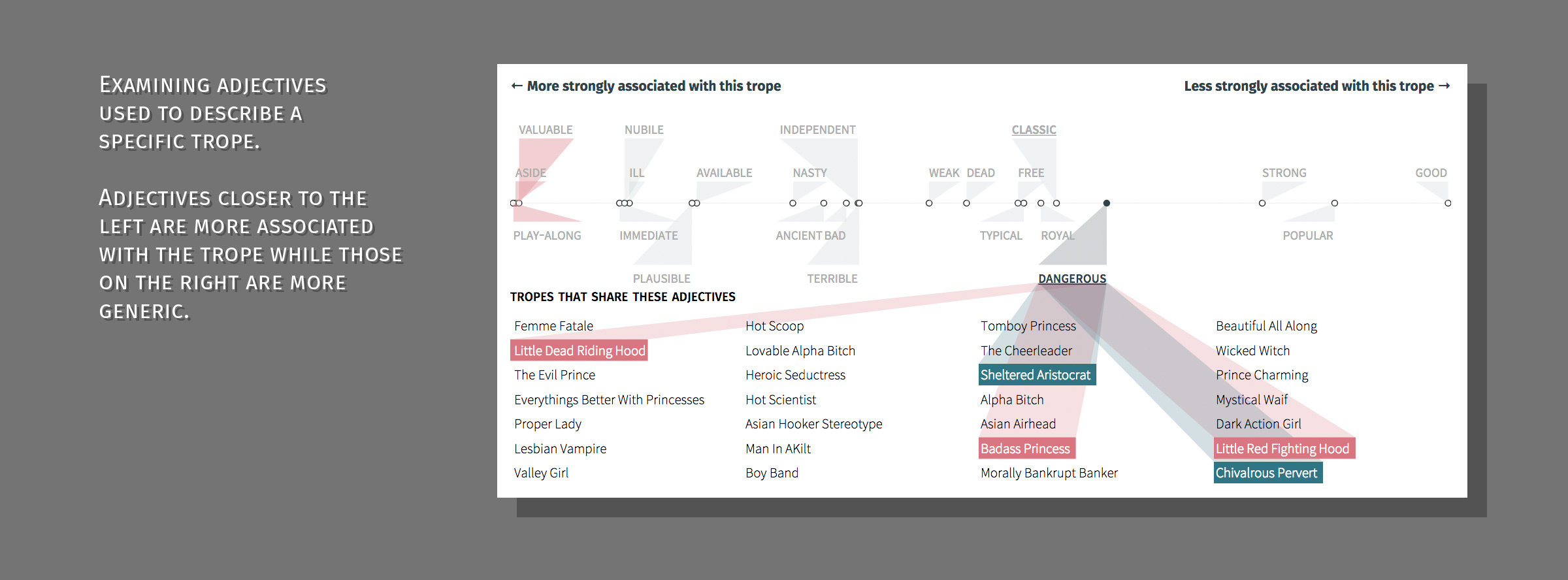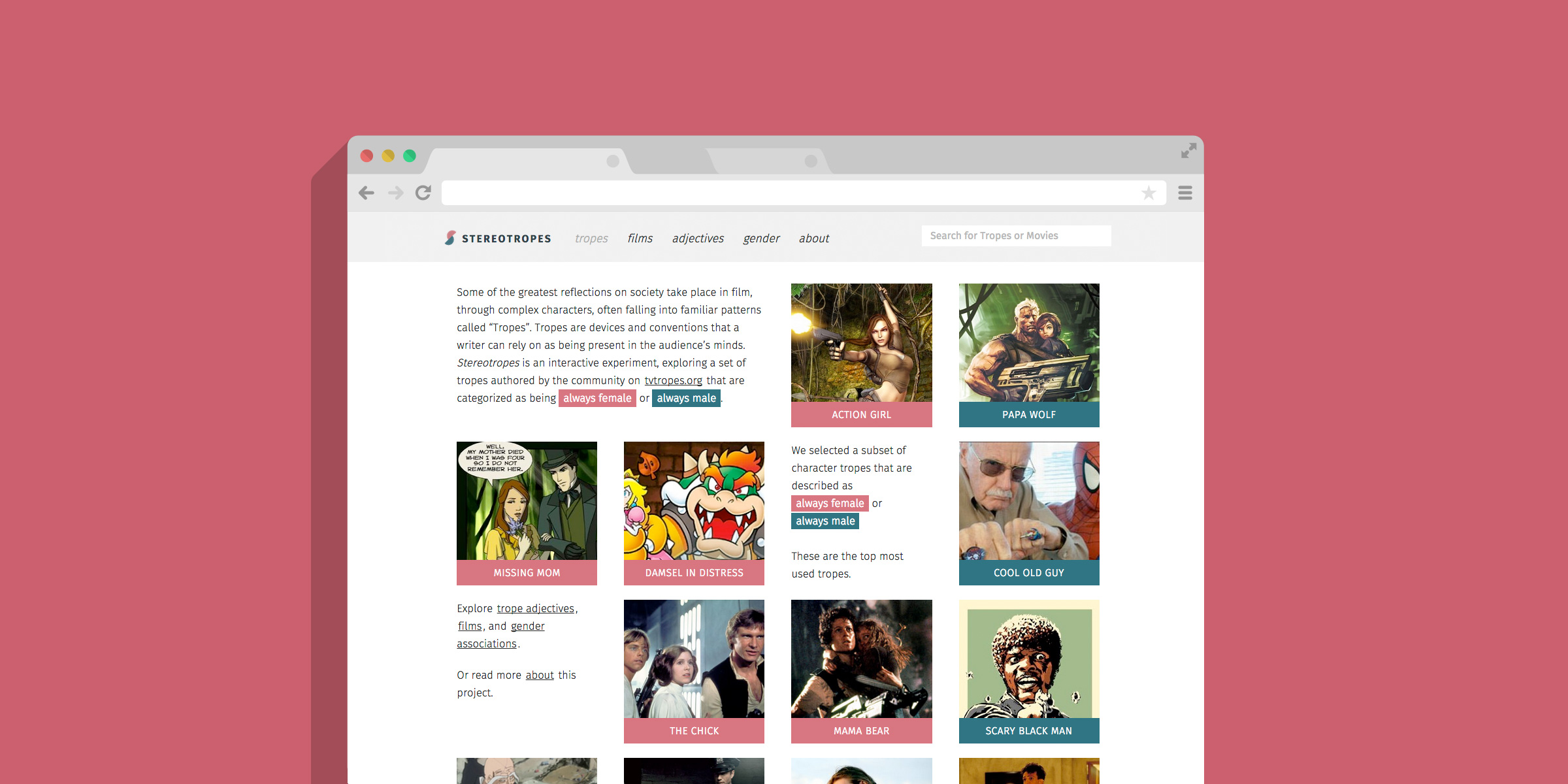 As a movie fan, I'm instantly on board with this project through subject alone, but I really love the focused slice of analysis the team has applied to this large topic, providing an excellent tool to investigate the way gender and character is portrayed on screen.